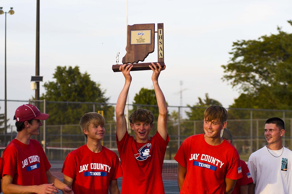Jay County High School volleyball team secured the outright Allen County Athletic Conference regular-season volleyball championship with a win over Class 3A No. 7 Heritage while the boys tennis team defeated Randolph Southern to earn its fourth consecutive sectional title. Pictured above, JCHS junior Hallie Schwieterman screams at Elizabeth Barnett (2) after rallying in the fourth set of the ACAC clincher. Schwieterman led JCHS with 19 kills while Barnett added 12. (The Commercial Review/Andrew Balko)