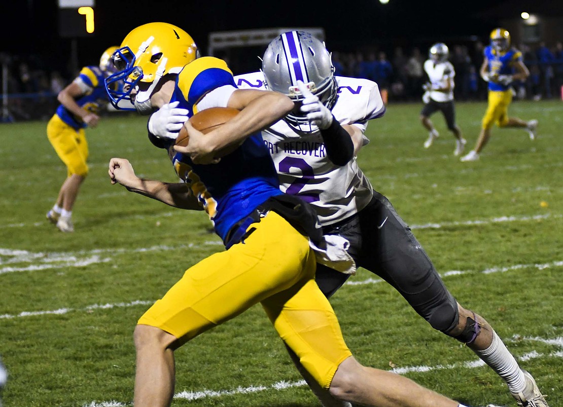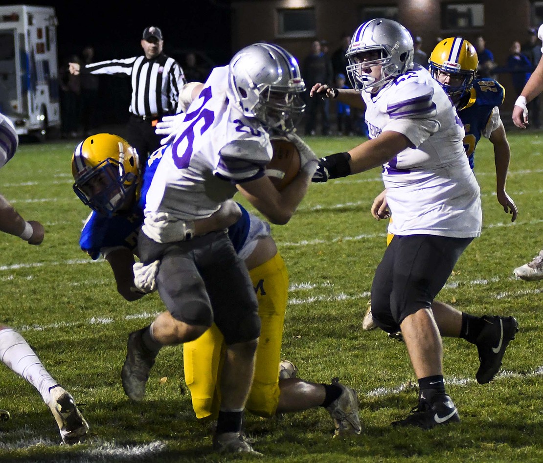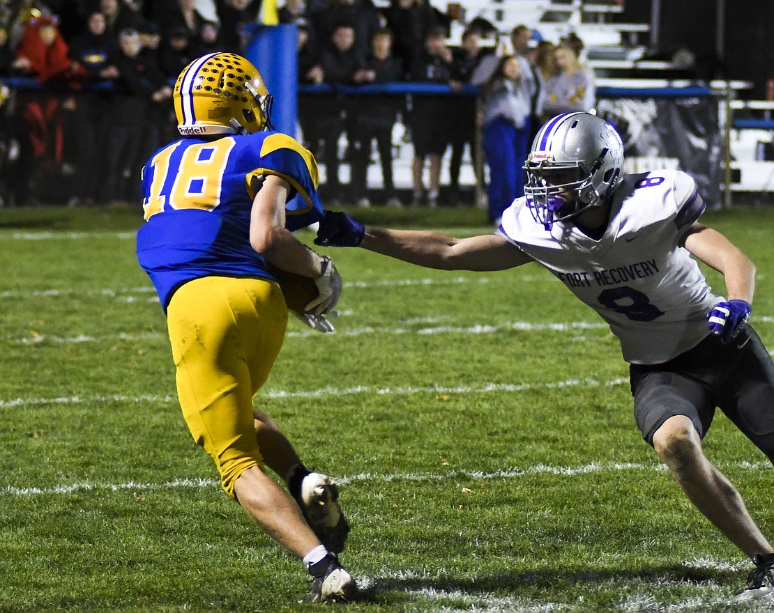 Fort Recovery High School’s Brody Barga rips Brayden Mescher out of bounds during the OHSAA Division VII Regional 28 semifinal game at Marion Local on Friday night. The Indians fell 35-0 to the undefeated Midwest Athletic Conference foe to finish the season with seven or more wins for just the fourth time in school history. (The Commercial Review/Andrew Balko)
