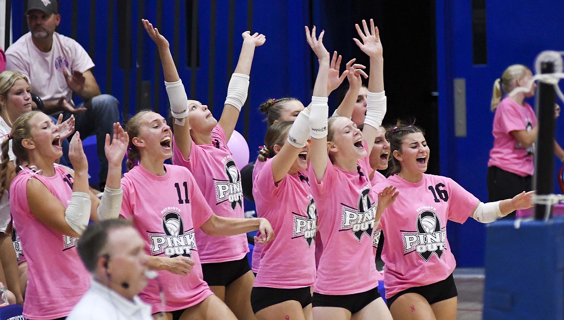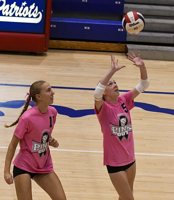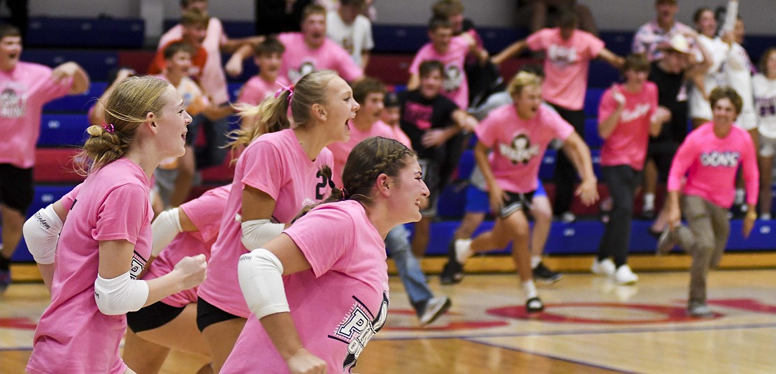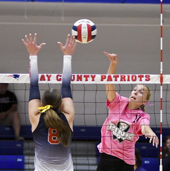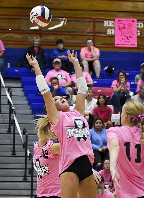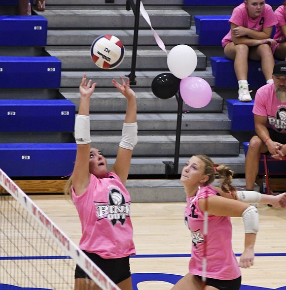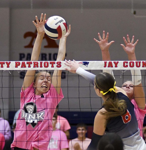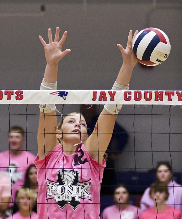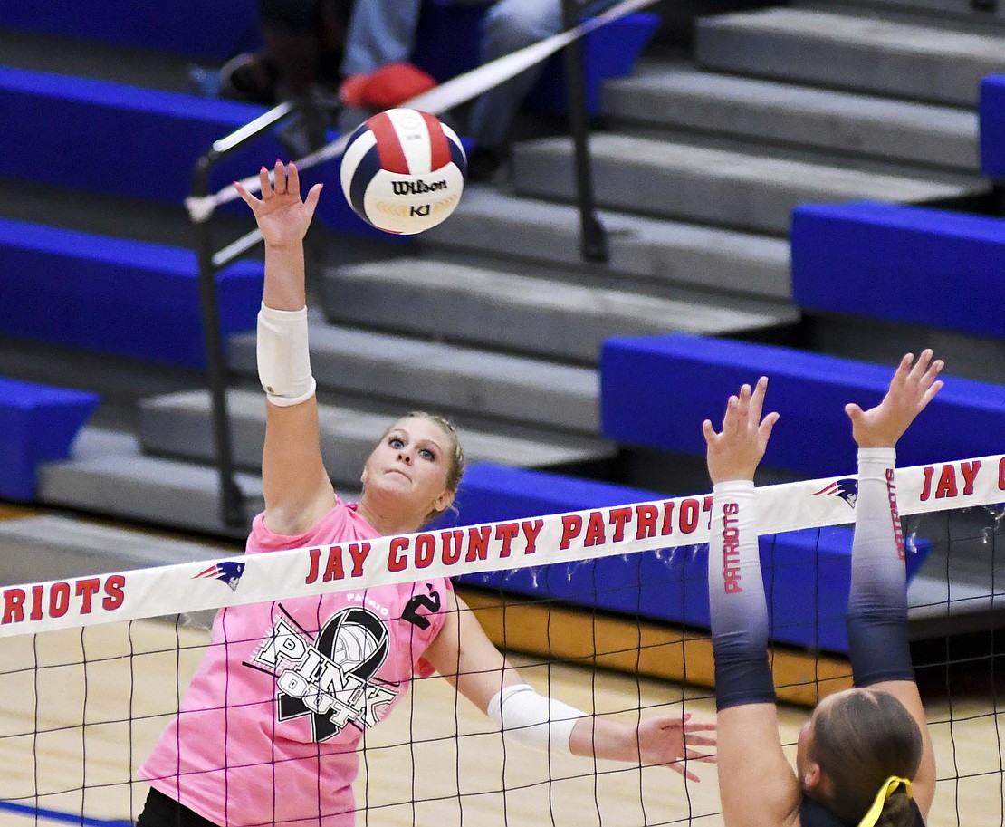 Jay County High School volleyball team secured the outright Allen County Athletic Conference regular-season volleyball championship with a win over Class 3A No. 7 Heritage while the boys tennis team defeated Randolph Southern to earn its fourth consecutive sectional title. Pictured above, JCHS junior Hallie Schwieterman screams at Elizabeth Barnett (2) after rallying in the fourth set of the ACAC clincher. Schwieterman led JCHS with 19 kills while Barnett added 12. (The Commercial Review/Andrew Balko)