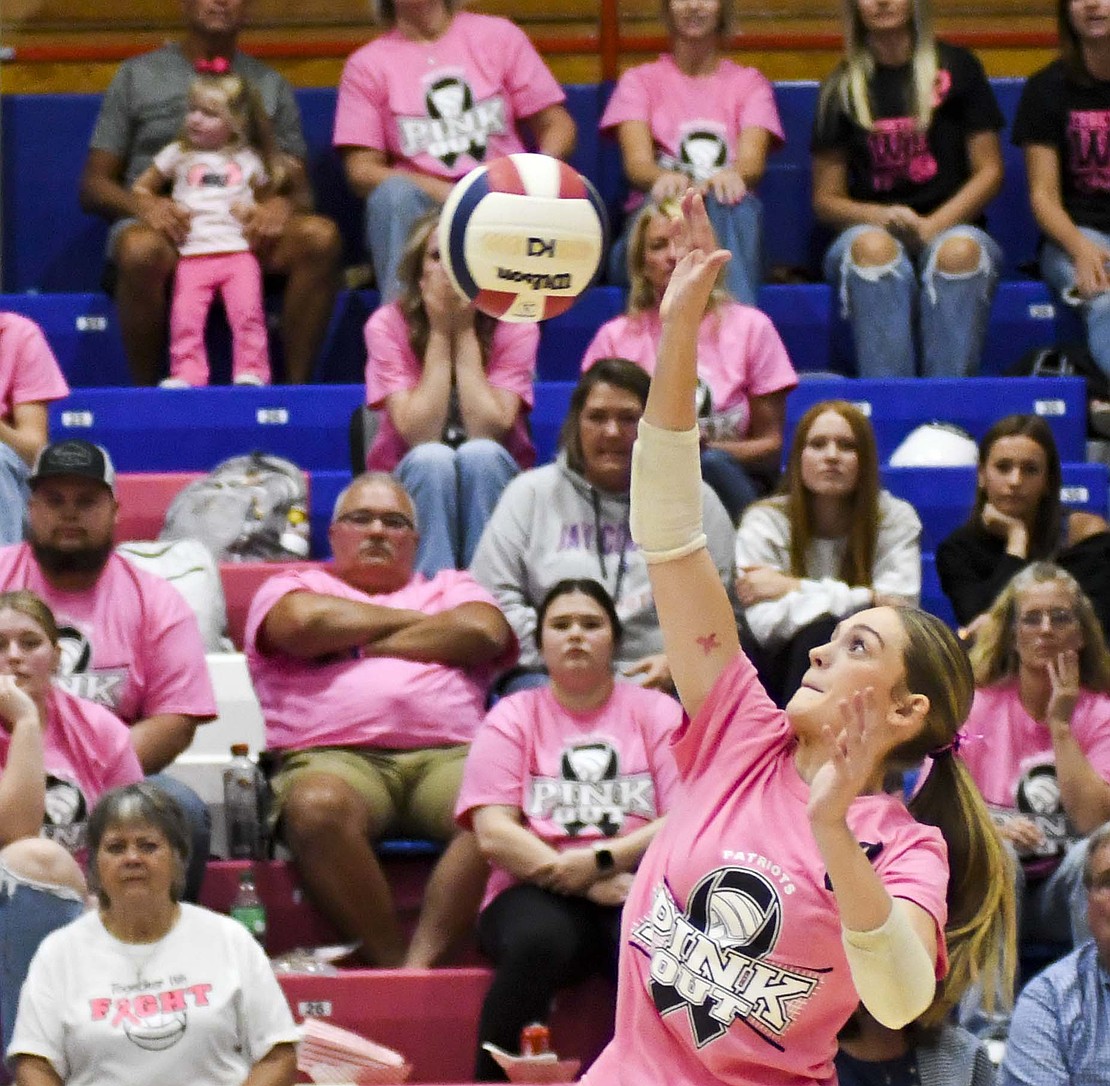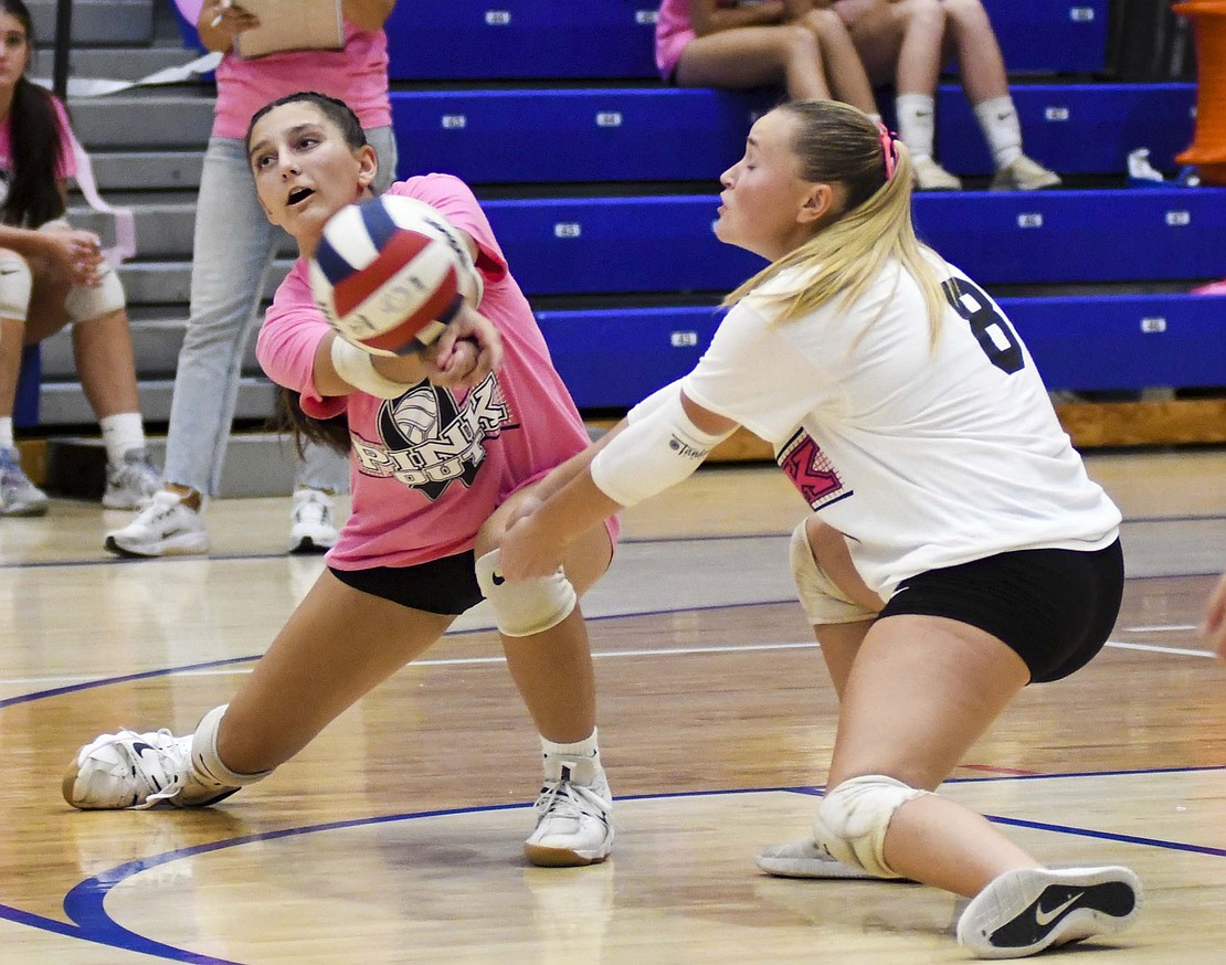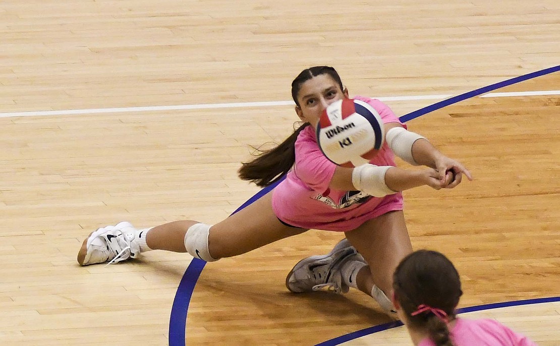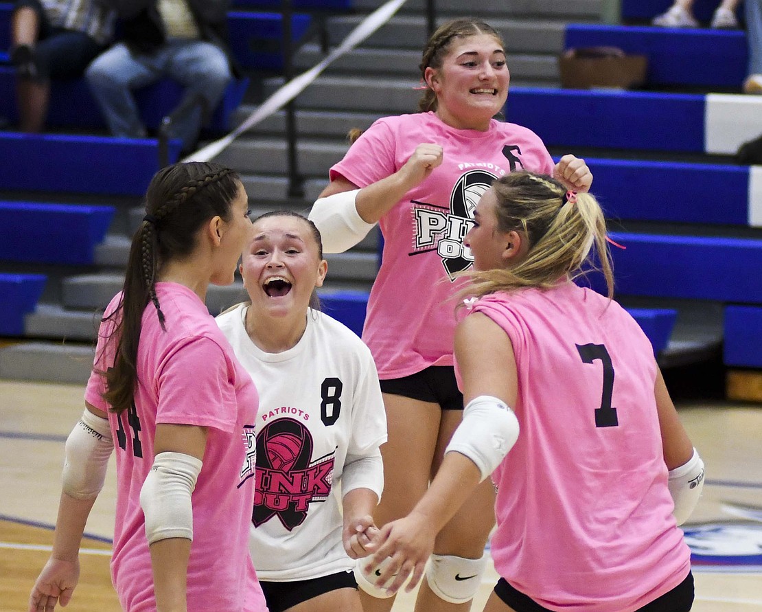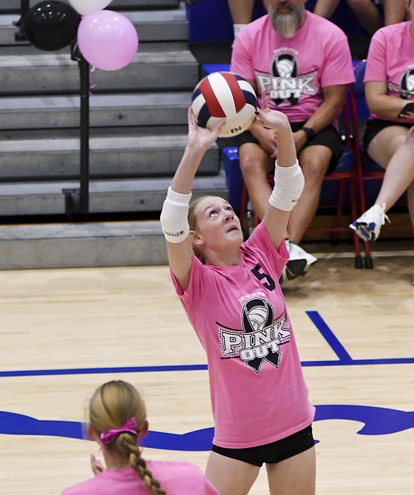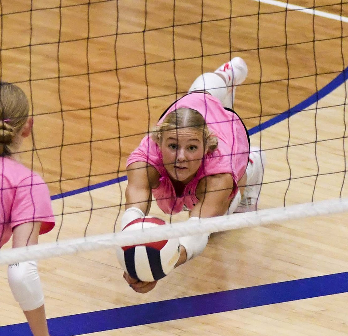 Jay County High School volleyball team secured the outright Allen County Athletic Conference regular-season volleyball championship with a win over Class 3A No. 7 Heritage while the boys tennis team defeated Randolph Southern to earn its fourth consecutive sectional title. Pictured above, JCHS junior Hallie Schwieterman screams at Elizabeth Barnett (2) after rallying in the fourth set of the ACAC clincher. Schwieterman led JCHS with 19 kills while Barnett added 12. (The Commercial Review/Andrew Balko)