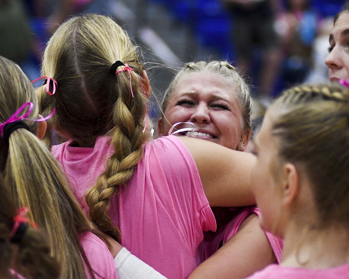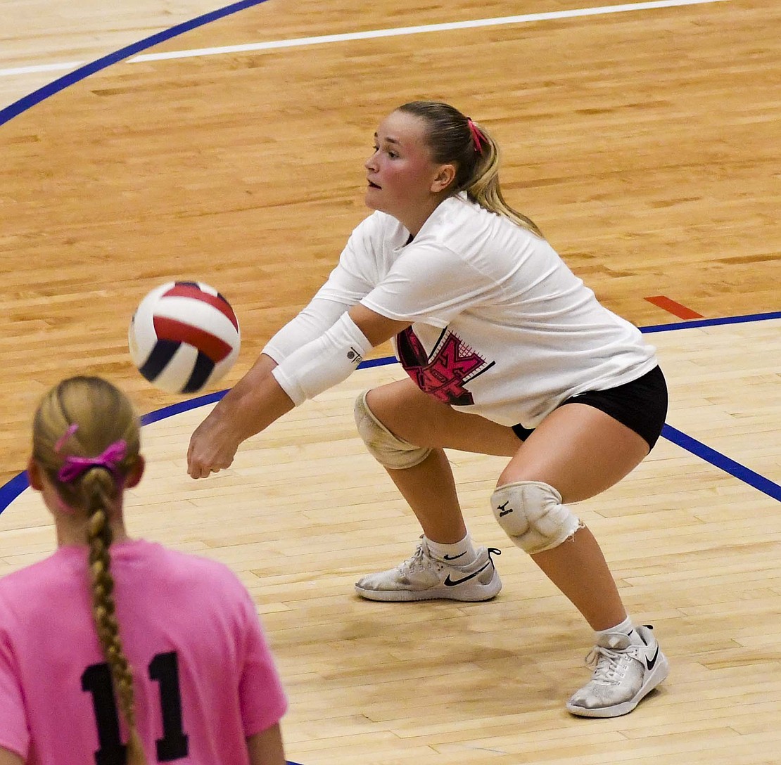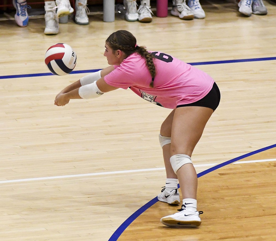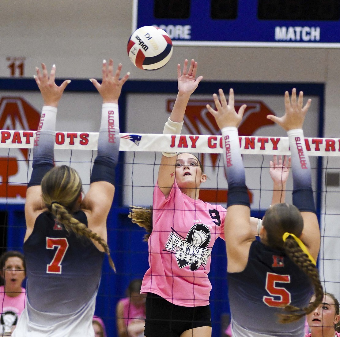 Jay County High School volleyball team secured the outright Allen County Athletic Conference regular-season volleyball championship with a win over Class 3A No. 7 Heritage while the boys tennis team defeated Randolph Southern to earn its fourth consecutive sectional title. Pictured above, JCHS junior Hallie Schwieterman screams at Elizabeth Barnett (2) after rallying in the fourth set of the ACAC clincher. Schwieterman led JCHS with 19 kills while Barnett added 12. (The Commercial Review/Andrew Balko)